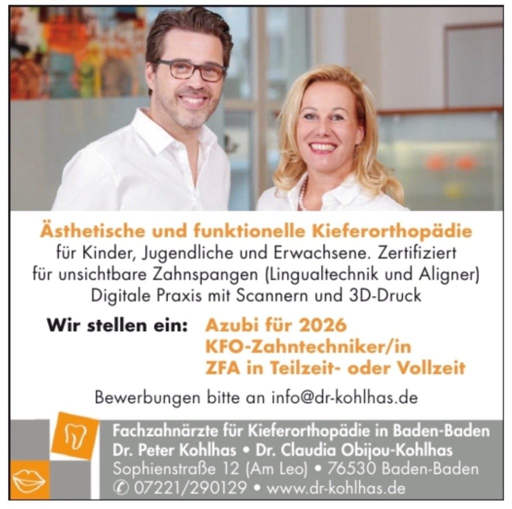 Uns gibt es bereits seit 1998 hier in Baden-Baden, so dass wir über viel Berufserfahrung verfügen. Wir freuen uns auf alle Kinder, Jugendliche und Erwachsene, denen gerade Zähne wichtig sind. In fast jedem Alter kann man noch etwas machen – die Behandlung erwachsener Patienten mit fast unsichtbaren Innenbrackets gehört zu einem unserer Spezialgebiete.